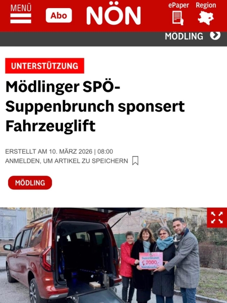 Der Suppenbrunch ist die größte Benefizveranstaltung in Mödling und auch 2025 kamen EUR 3.800,- Reinerlös zusammen. „Mit diesem Geld können wir wieder Projekte unterstützen, die Hilfe benötigen. So wie hier beim Fahrzeuglift. Es macht immer Freude, zu helfen“, berichtet die Bürgermeisterin Silvia Drechsler, die sich immer gerne mit ihrem Team in den Dienst der guten Sache stellt.